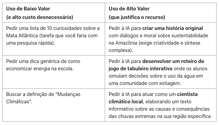 Para justificar o alto custo ambiental, o uso da IA precisa ter alto valor agregado na sua prática pedagógica. É ir além do ganhar tempo, para chegar na criação de melhores experiências de aprendizagem.